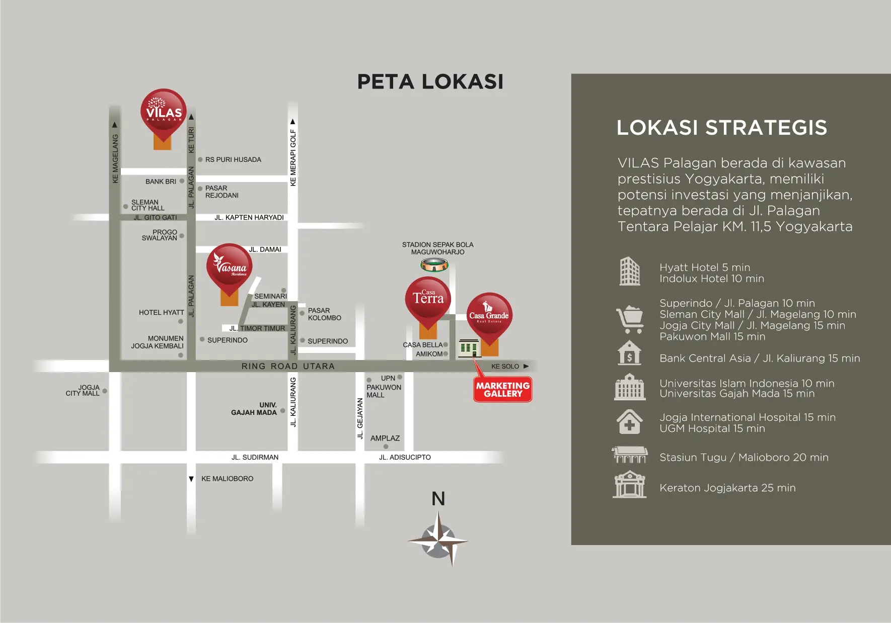 Berada di salah satu lokasi terbaik, Vilas Palagan akan ditunjang dengan beberapa fasilitas umum unggulan. ROW jalan yang luas, taman tematik yang tersebar dibeberapa area dan Club House yang berada di commercial area.